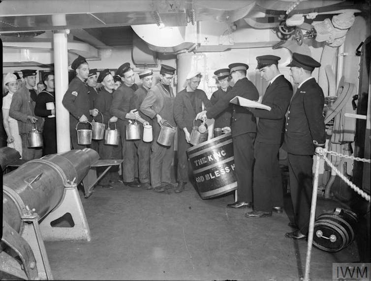 INITIALLY, SAILORS RECEIVED A DAILY GALLON OF BEER WITH MEALS. THIS WAS LATER CHANGED TO WATERED-DOWN RUM, THE INFAMOUS ‘GROG’, WHICH IS BEING HANDED OUT IN THIS 1940 PHOTO TAKEN ABOARD HMS KING GEORGE V. IMPERIAL WAR MUSEUMS, CC BY-NC